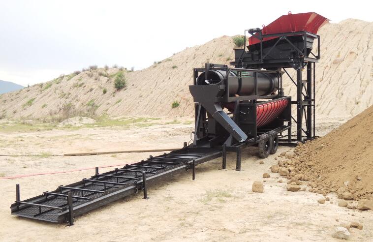 礦料經(jīng)過料斗進入振動篩,經(jīng)過篩分后大石塊廢料排棄,以免進入滾筒篩對其造成損傷,然后再進入滾筒篩進行洗礦、磨礦,對礦料進行擦洗.經(jīng)過摩擦洗礦后廢料、雜草、樹根等廢物排出,含金的礦料進入溜槽或其它選礦機內(nèi)進行選金。