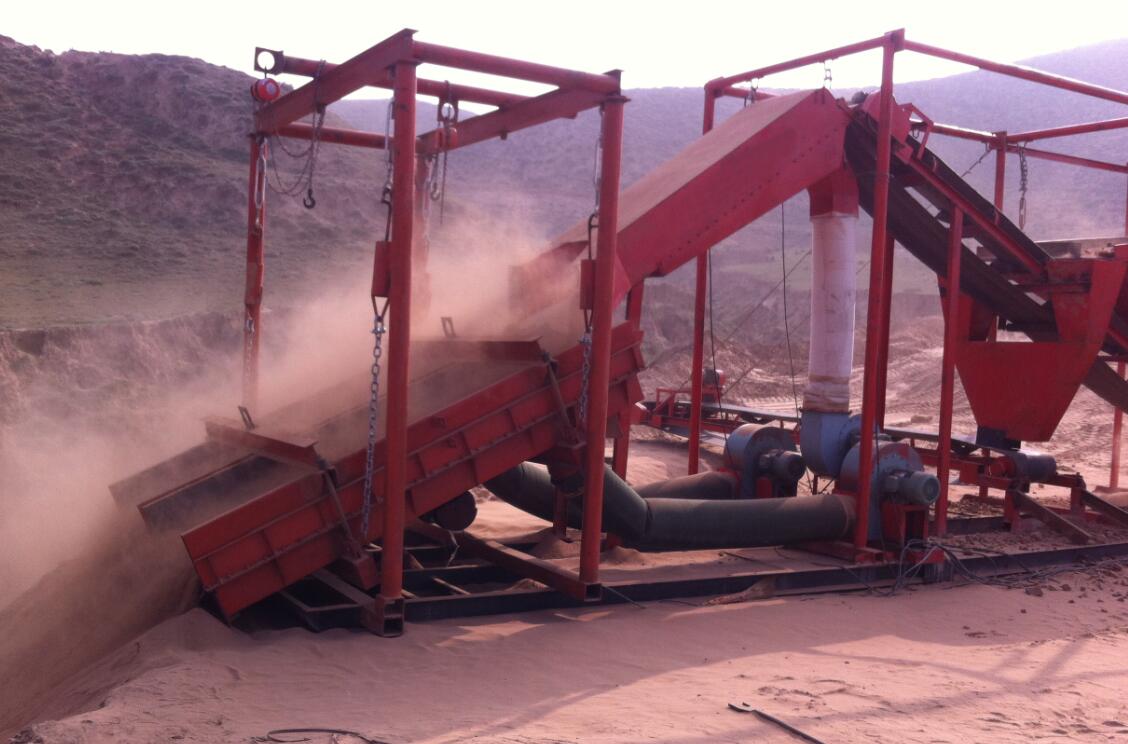 該設(shè)備是利用了風(fēng)吹代替了水沖,利用風(fēng)吹所產(chǎn)生的渦流代替了離心機(jī)的離心力,在風(fēng)力的作用下使比重輕的物料產(chǎn)生輕微的懸浮,并在外界物理所產(chǎn)生的動(dòng)力下使比重大的物料(如:金、鉑、鎢等)沉降,已達(dá)到與沙石料分離和富集回收,沙石料在風(fēng)壓和機(jī)械鼓動(dòng)的作用下被帶走。