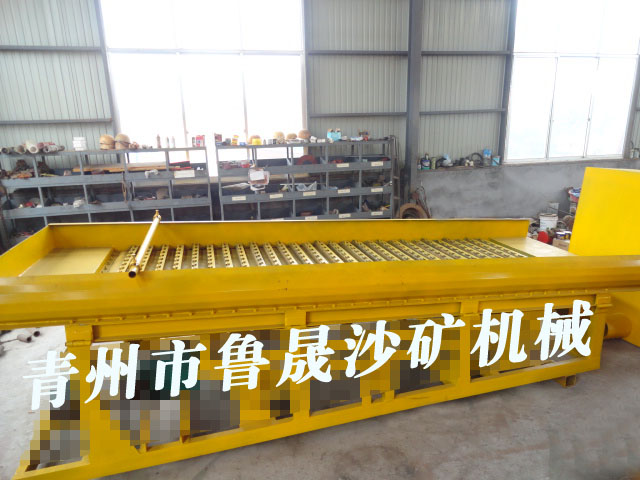 它的工作原理是上下鼓動(dòng),底部有硅膠板。硅膠板上部有隔水槽用于分流進(jìn)水和富集黃金。鼓動(dòng)溜槽通過(guò)上下鼓動(dòng)將輕重礦物分離,輕的沙子通過(guò)上下鼓動(dòng)的水流帶走排出為尾礦,精礦比重高會(huì)留在被隔水槽留住,留在隔水槽的底部。這種溜槽因?yàn)榘l(fā)明的時(shí)間早,知道此設(shè)備的人多,所以用的比較多。但是這個(gè)設(shè)備的弊端也非常的明顯,因?yàn)樗荒芑厥沾箢w粒的黃金,細(xì)顆粒的毛細(xì)金、片金、微粒金都會(huì)隨水跑掉的。
